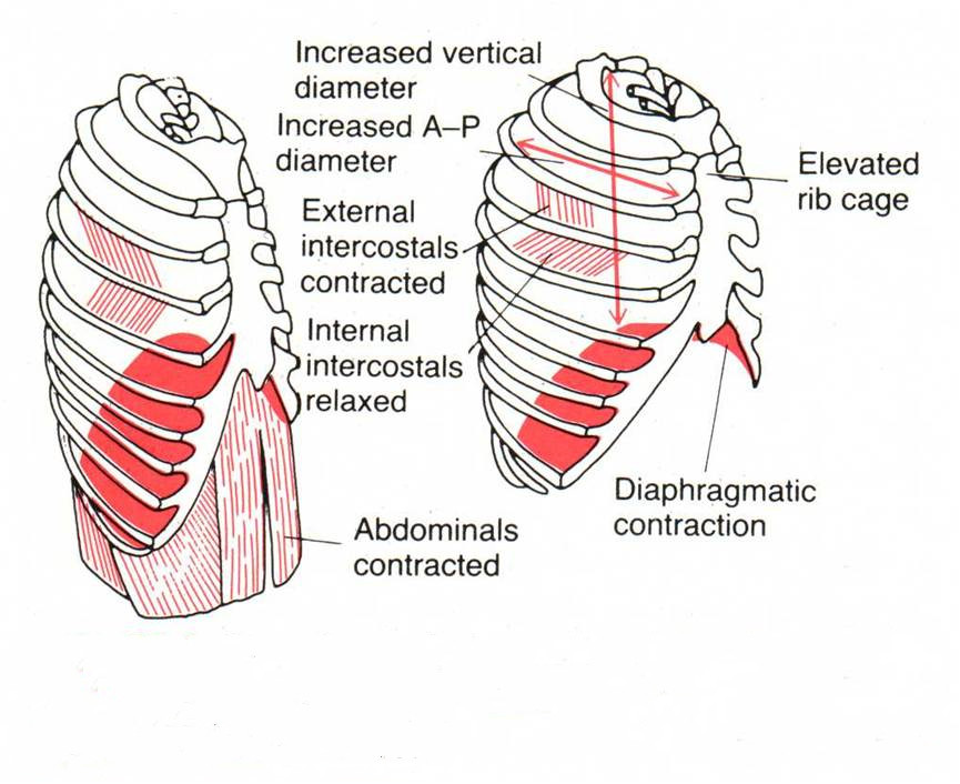 呼吸运动分为两类:腹式呼吸(垂直)和胸式呼吸(水平)。正常安静的呼吸属于腹式呼吸,横膈膜上下运动,引发胸腔缩短拉长。吸气的时候,横膈膜收缩,将两肺的内表面向下牵拉。呼气的时候,横膈膜放松,肺部和胸腔壁弹性收回,挤压肺部。然而,呼吸沉重时,弹力不够引起必要的呼吸。所以在这种情况下,腹部肌肉收缩,迫使腹部内容物向上运动,挤压横膈膜底部。
